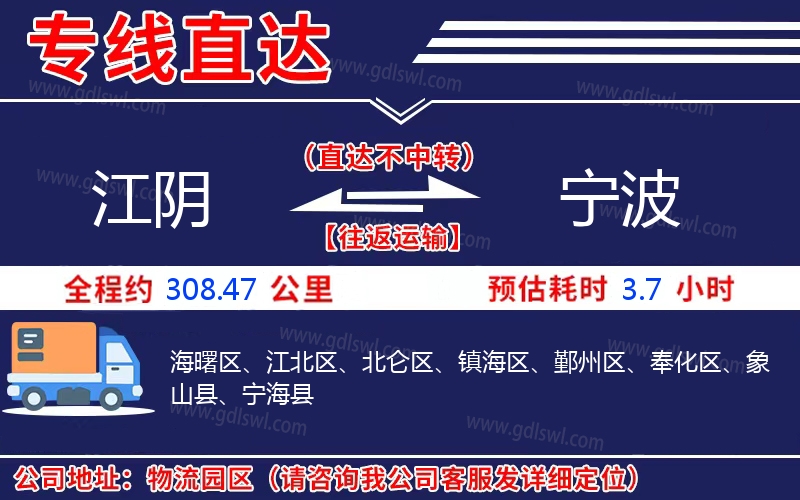 江陰到寧波物流專線是一條連接江陰和寧波的貨物運輸線路,由陸順物流公司提供直達不中轉(zhuǎn)運輸服務(wù),能為企業(yè)、工廠、貿(mào)易商以及個人提供高效、便捷、可靠的貨運解決方案