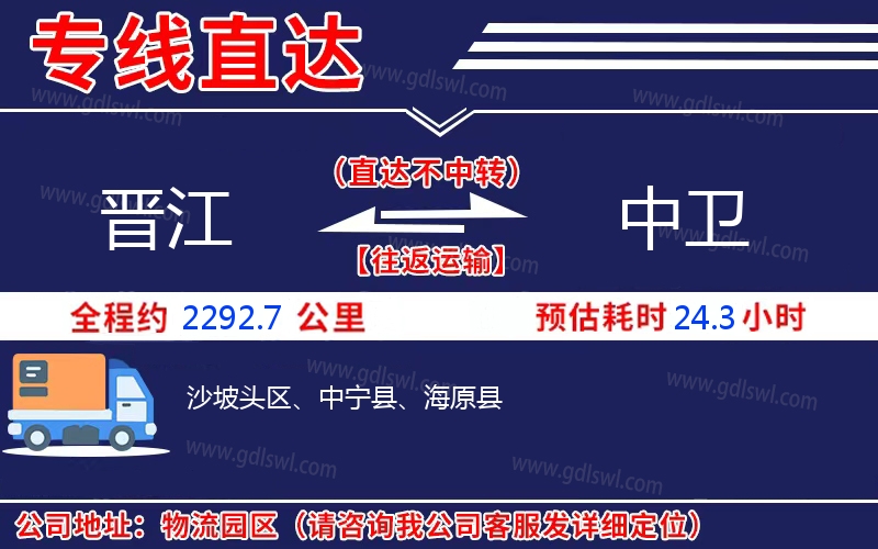 晉江到中衛(wèi)物流專線是一條連接晉江和中衛(wèi)的貨物運(yùn)輸線路,由陸順物流公司提供直達(dá)不中轉(zhuǎn)運(yùn)輸服務(wù),能為企業(yè)、工廠、貿(mào)易商以及個(gè)人提供高效、便捷、可靠的貨運(yùn)解決方案