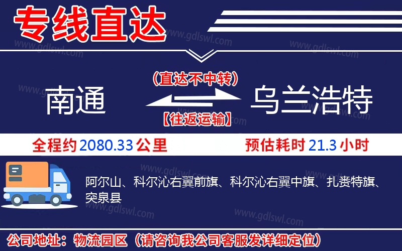 南通到烏蘭浩特物流專線是一條連接南通和烏蘭浩特的貨物運輸線路,由陸順物流公司提供直達不中轉(zhuǎn)運輸服務(wù),能為企業(yè)、工廠、貿(mào)易商以及個人提供高效、便捷、可靠的貨運解決方案