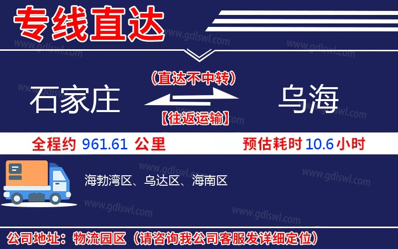 石家莊到烏海物流專線是一條連接石家莊和烏海的貨物運(yùn)輸線路,由陸順物流公司提供直達(dá)不中轉(zhuǎn)運(yùn)輸服務(wù),能為企業(yè)、工廠、貿(mào)易商以及個(gè)人提供高效、便捷、可靠的貨運(yùn)解決方案