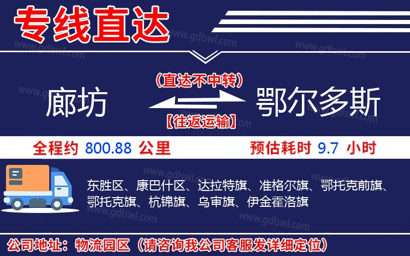 廊坊到鄂爾多斯物流專線是一條連接廊坊和鄂爾多斯的貨物運輸線路,由陸順物流公司提供直達(dá)不中轉(zhuǎn)運輸服務(wù),能為企業(yè)、工廠、貿(mào)易商以及個人提供高效、便捷、可靠的貨運解決方案